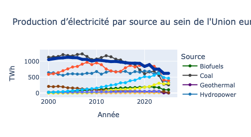 This development does not challenge the hierarchy of electricity sources when they are considered individually. Neither wind nor solar surpass nuclear power. Since 2023, nuclear energy has once again become the largest low-carbon source of electricity in the European Union, after having long been neck-and-neck with coal and then gas before the sharp decline of these two fossil fuels.