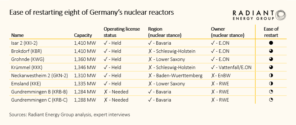 In its analysis, Radiant Energy Group ranks reactors according to the ease with which they can be restarted. There are three criteria: the status of the operating licence, the position of the Länder and the operator’s position. It is important to note that the “licence” column in the table below includes both operating and decommissioning licences. For example, the licence for dismantling the Gundremmingen reactors has already been issued.