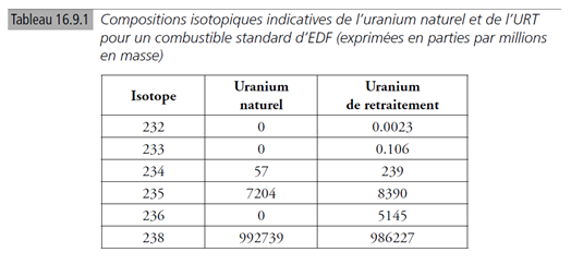 In addition to uranium 235, RU also contains many other isotopes. In the book “Histoire et technique des réacteurs nucléaires et de leurs combustibles” (Dominique Grenêche, EDP sciences), one can read for example: “it (RU) also contains a fairly high proportion of U236, which is of the order of 0.5% (…). However, this isotope is a neutron poison since it only captures neutrons without giving rise to a fissile isotope. Moreover, separating it from U235 in an industrial enrichment operation is impossible since the two isotopes have practically the same mass. U232 also poses a problem because it gives rise to descendants that pose radiological constraints.