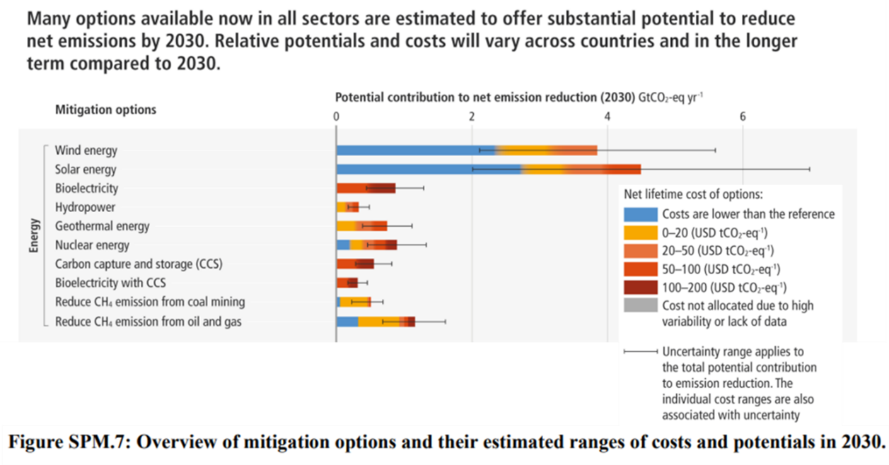 Comparing the cost per tonne avoided (Figure SPM.7) as an indicator, with that of the LCOE (Levelized Cost of Energy) has intrinsic methodological limitations. The IPCC report states in a footnote and under Figure SPM.3 that the costs per tonne of carbon avoided for solar and wind do not include system costs (flexibility, grid reinforcement, etc.). Therefore, this analysis should be onboarded with a certain level of scrutiny.
