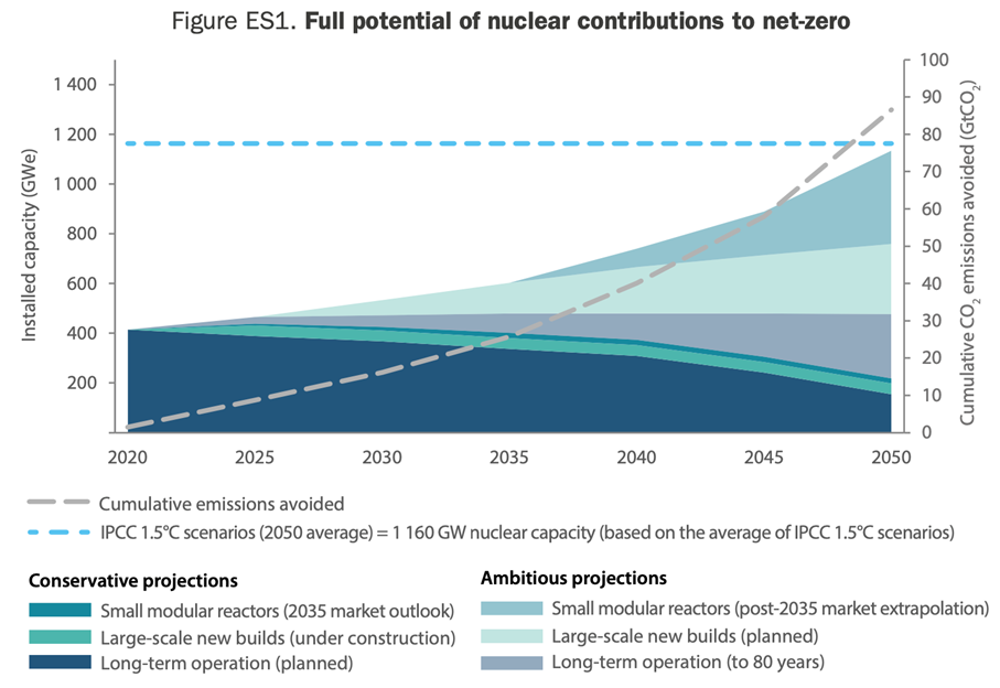 In 2018, the IPCC found that, on average, the 1.5°C scenario trajectories require nuclear energy to reach a capacity of 1,160 gigawatts of electricity by 2050, up from 394 gigawatts in 2020.