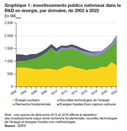 Public investment in energy research and development (R&D) reached a historical record in France in 2022, with €2,018 million, or about 0.08% of GDP, marking a rise for the third consecutive year despite the constraints on public finances. The share directed towards nuclear energy R&D, €824 million, decreased by 17% in 2022 compared to 2021, which was considered an “exceptional” year in terms of investment. This change is explained by “the decline in investments related to the Jules Horowitz research reactor project, which received significant funding accounted for in 2021.”