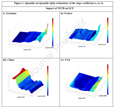 Broadly speaking, time series data show a negative correlation (each euro invested is correlated with a more or less significant reduction in the environmental footprint) between footprint and public R&D spending for all countries except Canada, supporting conclusions established by the literature. Now, let’s examine, using the quantile-quantile method results (see Method box), the variability of this correlation (which is negative except for Canada) according to variations in footprints and public spending. We will focus on the French, German, American, and Chinese cases for graphical representations (refer to table [5] at the end of the article for results for other countries).
